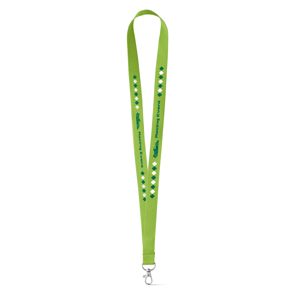Cordão de pescoço. Poliéster. Com mosquetão.