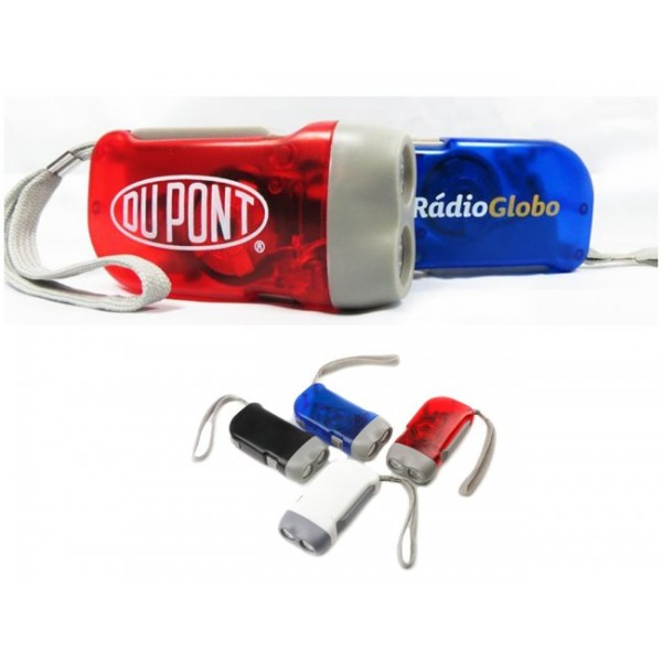 Lanterna plástica com 3 leds: Pressionando o “gatilho” gera energia para alimentar a lanterna dínamo. Possui botão para ligar/desligar lanterna, botão para travar gatilho e acompanha cordão.