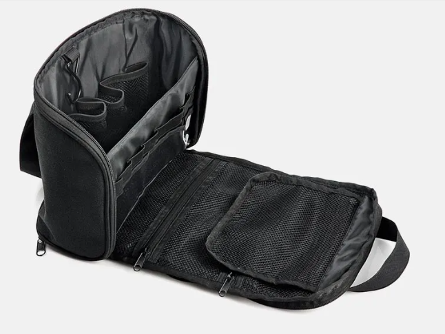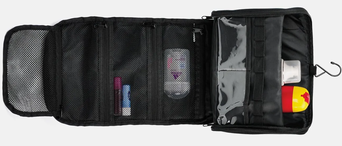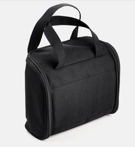 Necessaire confeccionada em polyester preto, conta com duas alças de mão para transporte, possui 11 divisórias internas em elásticos, 2 compartimentos em PVC, quatro bolsos em tela fechados com zíper e gancho preto em metal para pendurar. Perfeita para levar em viagens, bem espaçosa. 5L.